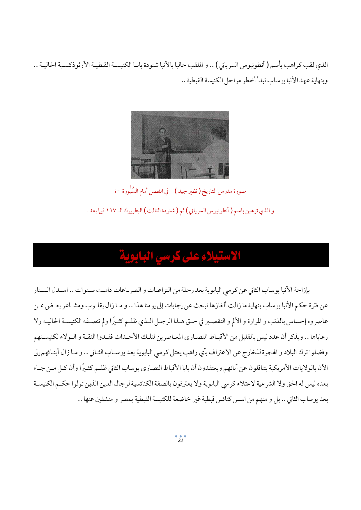 والذي لقب كراهب بأسم (أنطونيوس السرياني) .. والملقب حاليا بالأنبا شنودة بابا الكنيسة القبطية الأرثوذكسية الحالية .. وبنهاية عهد الأنبا يوساب تبدأ أخطر مراحل الكنيسة القبطية ..