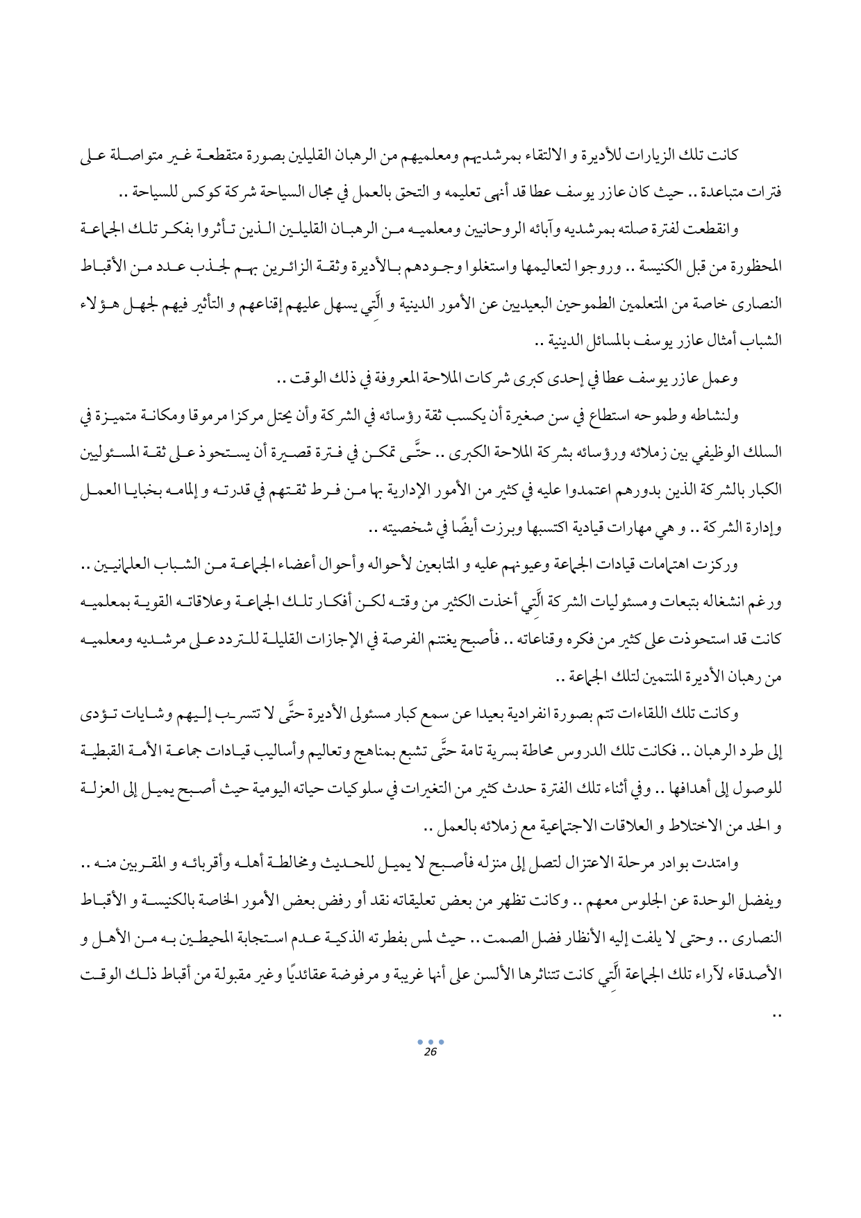 كانت تلك الزيارات للأديرة والالتقاء بمرشديهم ومعلميهم من الرهبان القليلين بصورة متقطعة غير متواصلة على فترات متباعدة .. حيث كان عازر يوسف عطا قد أنهى تعليمه والتحق بالعمل في مجال السياحة شركة كوكس للسياحة ..