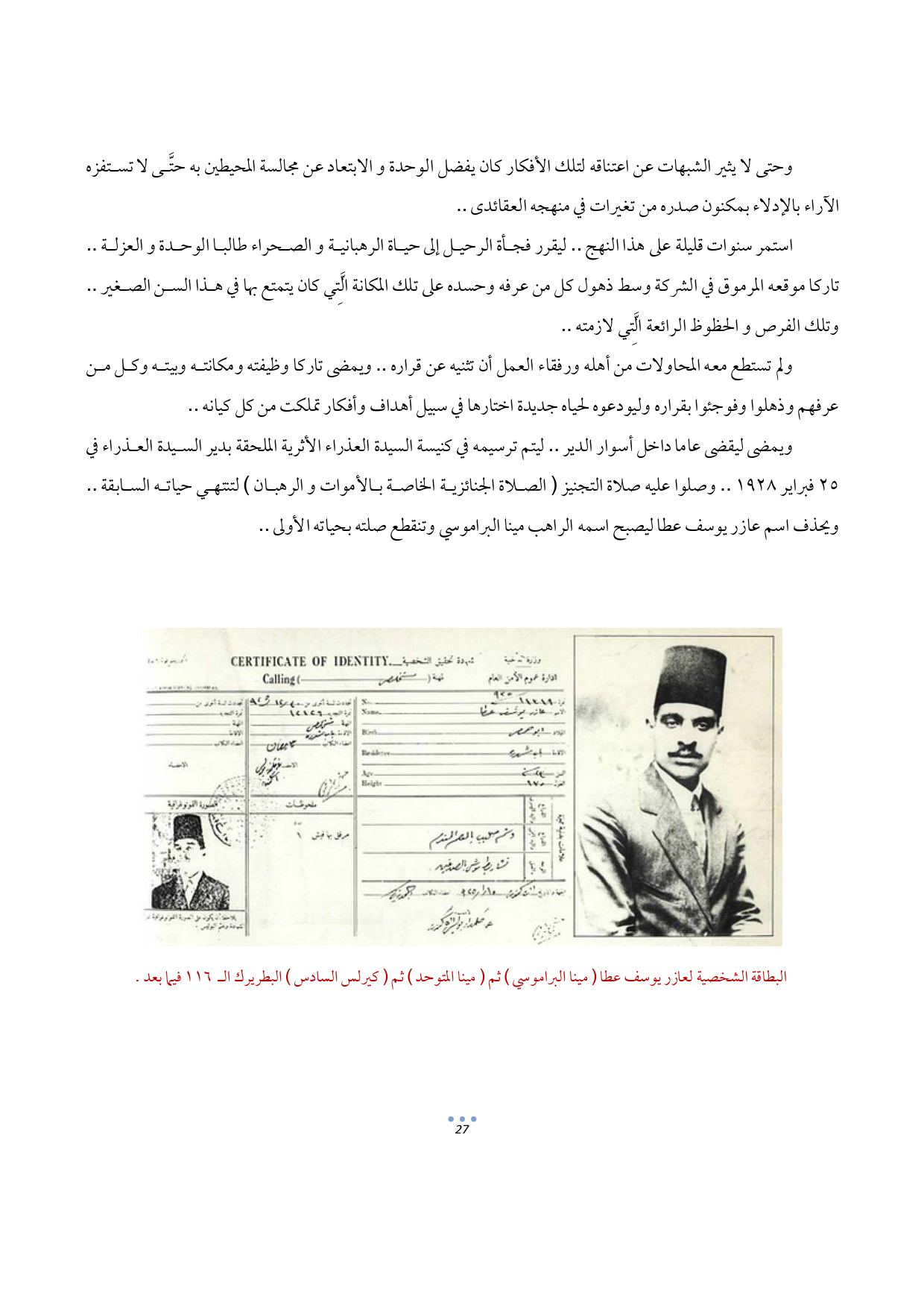 البطاقة الشخصية لعازر يوسف عطا (مينا البراموسي) ثم (مينا المتوحد) ثم (كيرلس السادس) البطريرك الـ 116 فيما بعد.