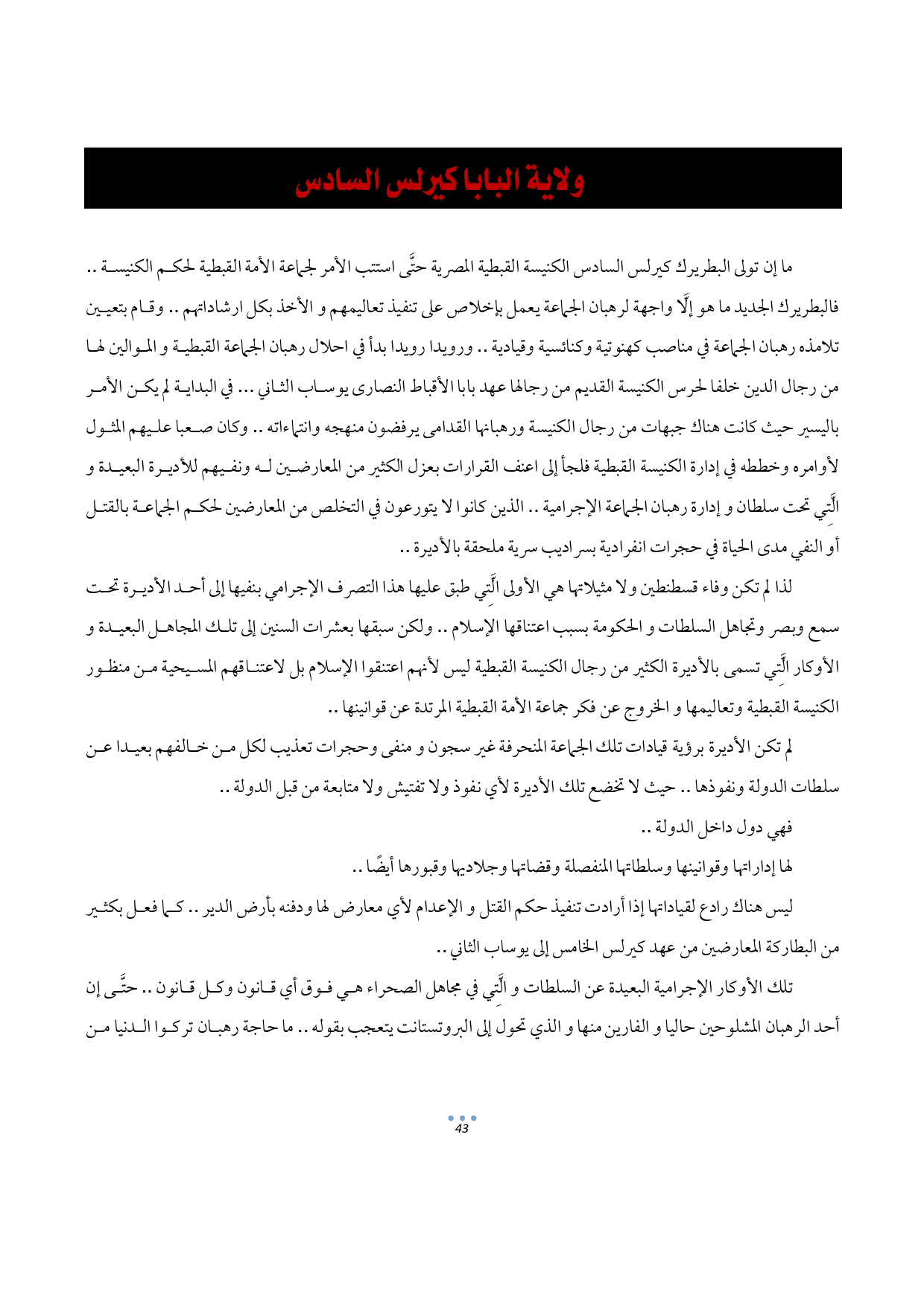 ما إن تولى البطريرك كيرلس السادس الكنيسة القبطية المصرية حتَّى استتب الأمر لجماعة الأمة القبطية لحكم الكنيسة .. فالبطريرك الجديد ما هو إلَّا واجهة لرهبان الجماعة يعمل بإخلاص على تنفيذ تعاليمهم والأخذ بكل ارشاداتهم .. وقام بتعيين تلامذه رهبان الجماعة في مناصب كهنوتية وكنائسية وقيادية .. ورويدا رويدا بدأ في احلال رهبان الجماعة القبطية والموالين لها من رجال الدين خلفا لحرس الكنيسة القديم من رجالها عهد بابا الأقباط النصارى يوساب الثاني ... في البداية لم يكن الأمر باليسير حيث كانت هناك جبهات من رجال الكنيسة ورهبانها القدامى يرفضون منهجه وانتماءاته .. وكان صعبا عليهم المثول لأوامره وخططه في إدارة الكنيسة القبطية فلجأ إلى اعنف القرارات بعزل الكثير من المعارضين له ونفيهم للأديرة البعيدة والَّتِي تحت سلطان وإدارة رهبان الجماعة الإجرامية .. الذين كانوا لا يتورعون في التخلص من المعارضين لحكم الجماعة بالقتل أو النفي مدى الحياة في حجرات انفرادية بسراديب سرية ملحقة بالأديرة ..
