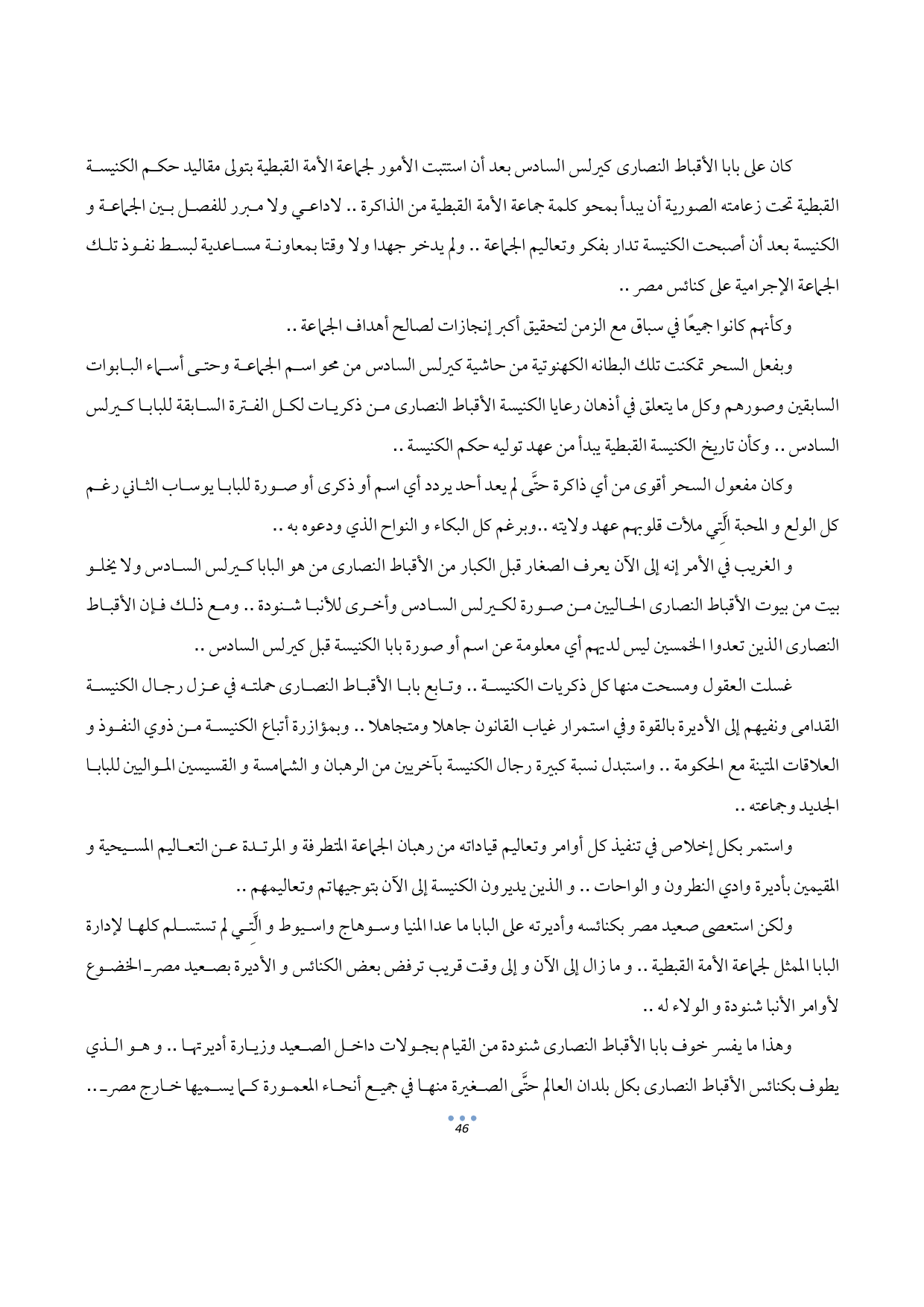 كان على بابا الأقباط النصارى كيرلس السادس بعد أن استتبت الأمور لجماعة الأمة القبطية بتولى مقاليد حكم الكنيسة القبطية تحت زعامته الصورية أن يبدأ بمحو كلمة جماعة الأمة القبطية من الذاكرة .. لاداعي ولا مبرر للفصل بين الجماعة والكنيسة بعد أن أصبحت الكنيسة تدار بفكر وتعاليم الجماعة .. ولم يدخر جهدا ولا وقتا بمعاونة مساعدية لبسط نفوذ تلك الجماعة الإجرامية على كنائس مصر ..