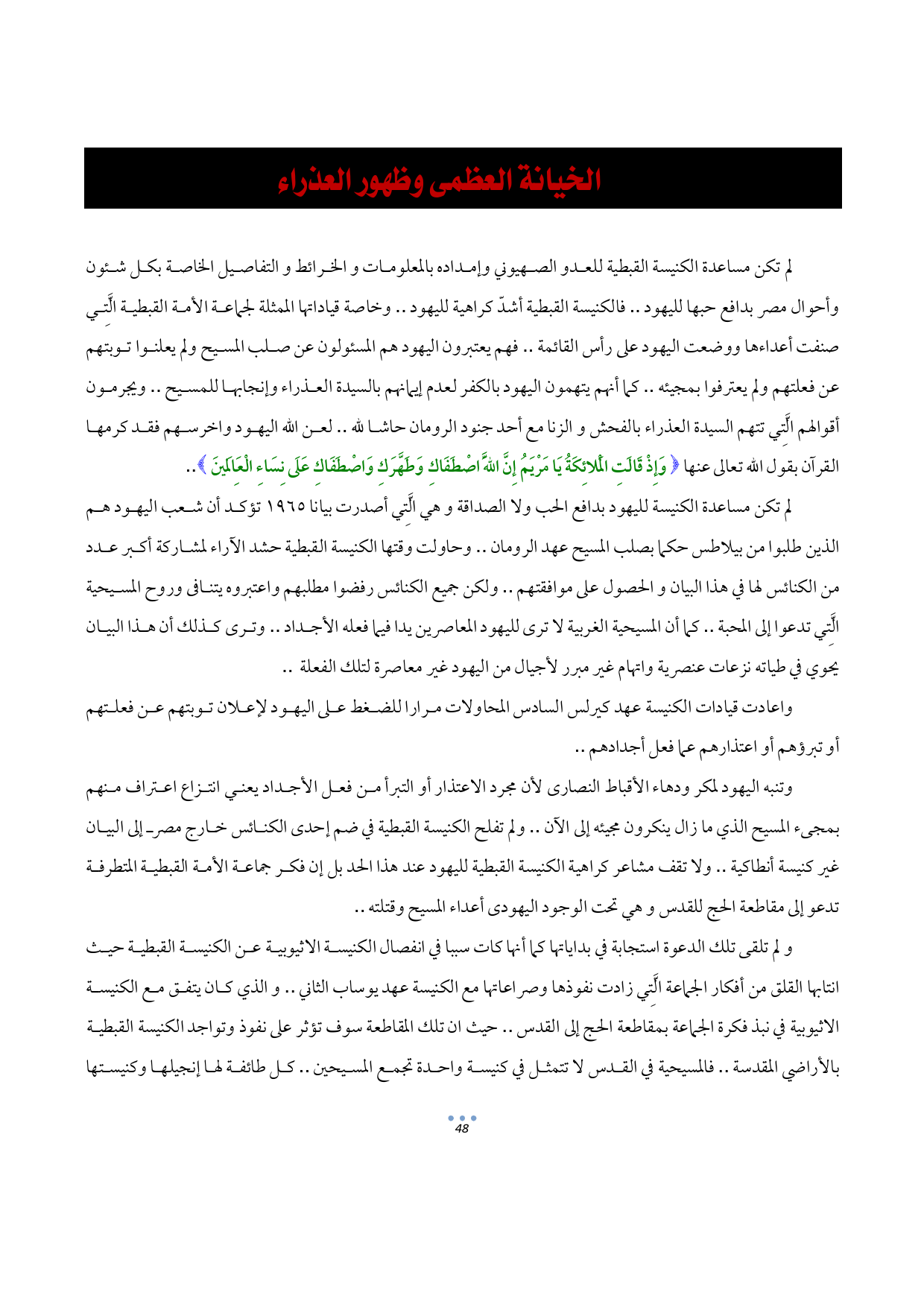 لم تكن مساعدة الكنيسة القبطية للعدو الصهيوني وإمداده بالمعلومات والخرائط والتفاصيل الخاصة بكل شئون وأحوال مصر بدافع حبها لليهود .. فالكنيسة القبطية أشدّ كراهية لليهود .. وخاصة قياداتها الممثلة لجماعة الأمة القبطية الَّتِي صنفت أعداءها ووضعت اليهود على رأس القائمة .. فهم يعتبرون اليهود هم المسئولون عن صلب المسيح ولم يعلنوا توبتهم عن فعلتهم ولم يعترفوا بمجيئه .. كما أنهم يتهمون اليهود بالكفر لعدم إيمانهم بالسيدة العذراء وإنجابها للمسيح .. ويجرمون أقوالهم الَّتِي تتهم السيدة العذراء بالفحش والزنا مع أحد جنود الرومان حاشا لله .. لعن الله اليهود واخرسهم فقد كرمها القرآن بقول الله تعالى عنها {وَإِذْ قَالَتِ الْمَلائِكَةُ يَا مَرْيَمُ إِنَّ اللَّهَ اصْطَفَاكِ وَطَهَّرَكِ وَاصْطَفَاكِ عَلَى نِسَاءِ الْعَالَمِينَ} ..