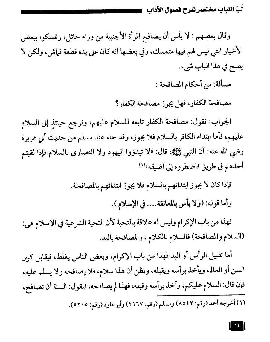 الجواب: نقول: مصافحة الكفار تابعه للسلام عليهم، ونرجع حينئذٍ إلى السلام عليهم، فأما ابتداء الكافر بالسلام فلا يجوز، وقد جاء عند مسلم من حديث أبي هريرة - رضي الله عنه -: أن النبي - صلى الله عليه وسلم -، قال: «لا تبدؤوا اليهود ولا النصارى بالسلام فإذا لقيتم أحدهم في طريق فاضطروه إلى أضيقه» (¬1).