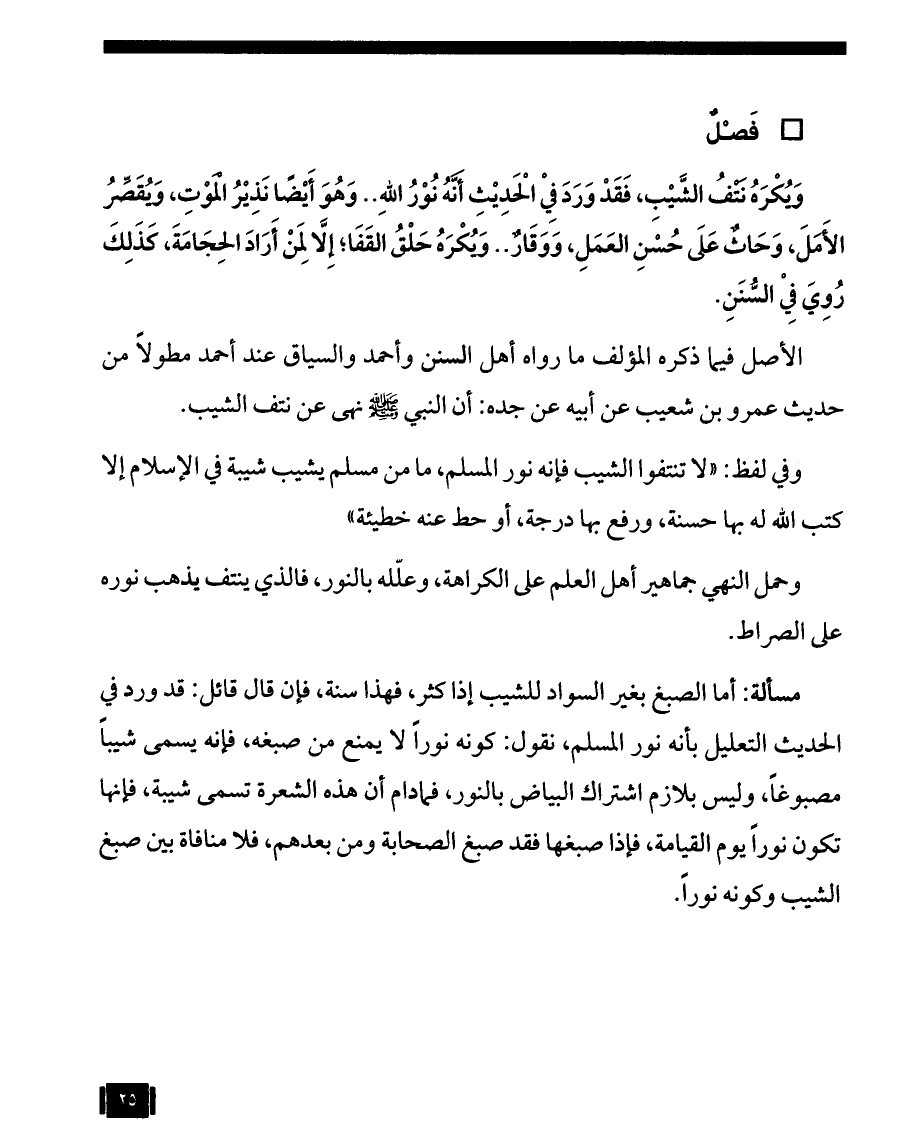 وَيُكْرَهُ نَتْفُ الشَّيْبِ، فَقَدْ وَرَدَ فِيْ الْحَدِيْثِ أَنَّهُ نُوْرُ اللهِ. . وَهُوَ أَيْضًا نَذِيْرُ الْمَوْتِ، وَيُقَصِّرُ الأَمَلَ، وَحَاثٌ عَلَى حُسْنِ العَمَلِ، وَوَقَارٌ. وَيُكْرَهُ حَلْقُ القَفَا؛ إِلَّا لِمَنْ أَرَادَ الحِجَامَةَ، كَذَلِكَ رُوِيَ فِيْ السُّنَنِ.