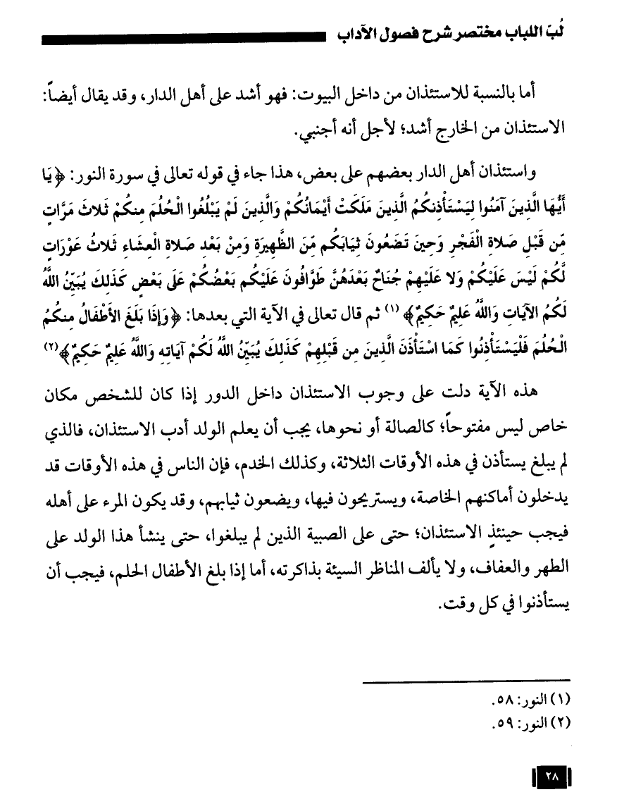 واستئذان أهل الدار بعضهم على بعض، هذا جاء في قوله تعالى في سورة النور: (يَا أَيُّهَا الَّذِينَ آَمَنُوا لِيَسْتَأْذِنْكُمُ الَّذِينَ مَلَكَتْ أَيْمَانُكُمْ وَالَّذِينَ لَمْ يَبْلُغُوا الْحُلُمَ مِنْكُمْ ثَلَاثَ مَرَّاتٍ مِنْ قَبْلِ صَلَاةِ الْفَجْرِ وَحِينَ تَضَعُونَ ثِيَابَكُمْ مِنَ الظَّهِيرَةِ وَمِنْ بَعْدِ صَلَاةِ الْعِشَاءِ ثَلَاثُ عَوْرَاتٍ لَكُمْ لَيْسَ عَلَيْكُمْ وَلَا عَلَيْهِمْ جُنَاحٌ بَعْدَهُنَّ طَوَّافُونَ عَلَيْكُمْ بَعْضُكُمْ عَلَى بَعْضٍ كَذَلِكَ يُبَيِّنُ اللَّهُ لَكُمُ الْآَيَاتِ وَاللَّهُ عَلِيمٌ حَكِيمٌ) (¬1) ثم قال تعالى في الآية التي بعدها: (وَإِذَا بَلَغَ الْأَطْفَالُ مِنْكُمُ الْحُلُمَ فَلْيَسْتَأْذِنُوا كَمَا اسْتَأْذَنَ الَّذِينَ مِنْ قَبْلِهِمْ كَذَلِكَ يُبَيِّنُ اللَّهُ لَكُمْ آَيَاتِهِ وَاللَّهُ عَلِيمٌ حَكِيمٌ) (¬2).
