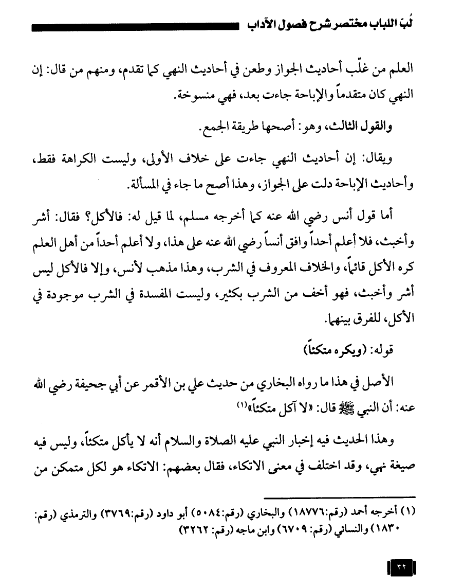 وهذا الحديث فيه إخبار النبي عليه الصلاة والسلام أنه لا يأكل متكئًا، وليس فيه صيغة نهي، وقد اختلف في معنى الاتكاء، فقال بعضهم: الاتكاء هو لكل متمكن من