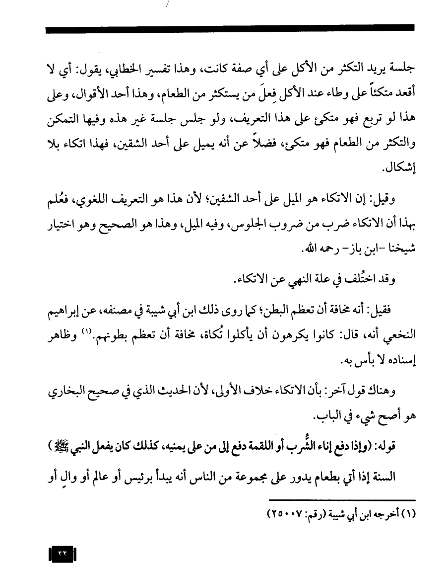 وقيل: إن الاتكاء هو الميل على أحد الشقين؛ لأن هذا هو التعريف اللغوي، فعُلم بهذا أن الاتكاء ضرب من ضروب الجلوس، وفيه الميل، وهذا هو الصحيح وهو اختيار شيخنا -ابن باز- رحمه الله.
