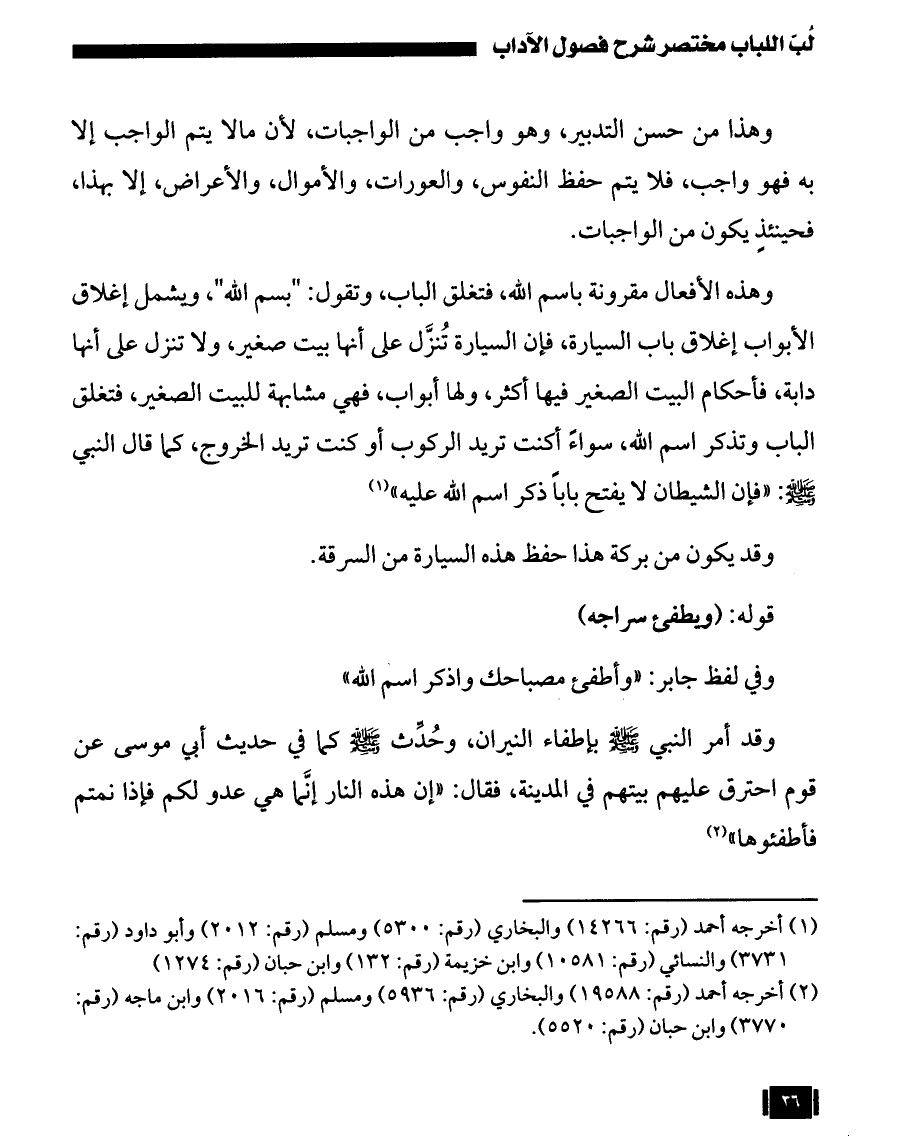 وهذه الأفعال مقرونة باسم الله، فتغلق الباب، وتقول: "بسم الله"، ويشمل إغلاق الأبواب إغلاق باب السيارة، فإن السيارة تُنزَّل على أنها بيت صغير، ولا تنزل على أنها دابة، فأحكام البيت الصغير فيها أكثر، ولها أبواب، فهي مشابهة للبيت الصغير، فتغلق الباب وتذكر اسم الله، سواءً أكنت تريد الركوب أو كنت تريد الخروج، كما قال النبي - صلى الله عليه وسلم -: «فإن الشيطان لا يفتح بابًا ذكر اسم الله عليه» (¬1).