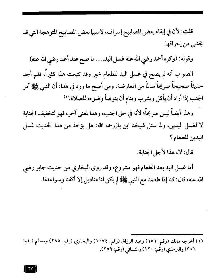 وهذا أيضًا ليس صريحًا؛ لأنه في حق الجنب، وهذا لمعنى آخر، فهو لتخفيف الجنابة لا لغسل اليدين، ولما سئل شيخنا ابن باز - رحمه الله -: هل يؤخذ من هذا الحديث غسل اليدين للطعام؟