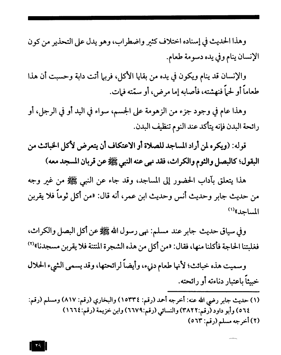 هذا يتعلق بآداب الحضور إلى المساجد، وقد جاء عن النبي - صلى الله عليه وسلم - من غير وجه من حديث جابر وحديث أنس وحديث ابن عمر، أنه قال: «من أكل ثومًا فلا يقربن المساجد» (¬1).