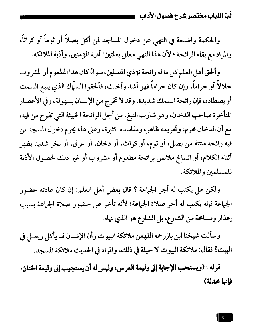وألحق أهل العلم كل ما له رائحة تؤذي المصلين، سواءً كان هذا المطعوم أو المشروب حلالاً أو حرامًا، وإن كان حرامًا فهو أشد وأخبث، فألحقوا السمّاك الذي يبيع السمك أو يصطاده، فإن رائحة السمك شديدة، وقد لا تخرج من الإنسان بسهولة، وفي الأعصار المتأخرة صاحب الدخان، وهو شارب التبغ، من أجل الرائحة الخبيثة التي تفوح من فيه، مع أن الدخان محرم، وتحريمه ظاهر، ومفاسده كثيرة، وعلى هذا يحرم دخول المسجد لمن فيه رائحة منتنة من بصل، أو ثوم، أو كراث، أو دخان، أو عرق، أو بخر شديد يظهر أثناء الكلام، أو اتساخ ملابس برائحة مطعوم أو مشروب أو غير ذلك لحصول الأذية للمسلمين والملائكة.