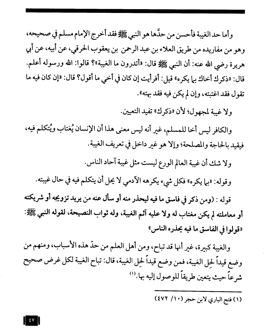 وأما حد الغيبة فأحسن من حدَّها هو النبي - صلى الله عليه وسلم - فقد أخرج الإمام مسلم في صحيحه، وهو من مفاريده من طريق العلاء بن عبد الرحمن بن يعقوب الحرقي، عن أبيه، عن أبي هريرة - رضي الله عنه -: أن النبي - صلى الله عليه وسلم - قال: «أتدرون ما الغيبة»؟ قالوا: الله ورسوله أعلم. قال: «ذكرك أخاك بما يكره» قيل: أفرأيت إن كان في أخي ما أقول؟ قال: «إن كان فيه ما تقول فقد اغتبته، وإن لم يكن فيه فقد بهته».