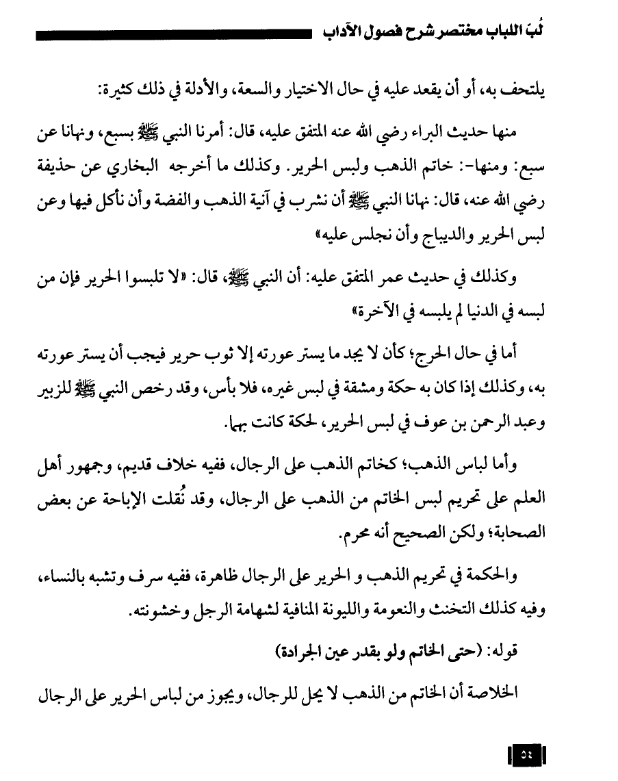 أما في حال الحرج؛ كأن لا يجد ما يستر عورته إلا ثوب حرير فيجب أن يستر عورته به، وكذلك إذا كان به حكة ومشقة في لبس غيره، فلا بأس، وقد رخص النبي - صلى الله عليه وسلم - للزبير وعبد الرحمن بن عوف في لبس الحرير، لحكة كانت بهما. وأما لباس الذهب؛ كخاتم الذهب على الرجال، ففيه خلاف قديم، وجمهور أهل العلم على تحريم لبس الخاتم من الذهب على الرجال، وقد نُقلت الإباحة عن بعض الصحابة؛ ولكن الصحيح أنه محرم.