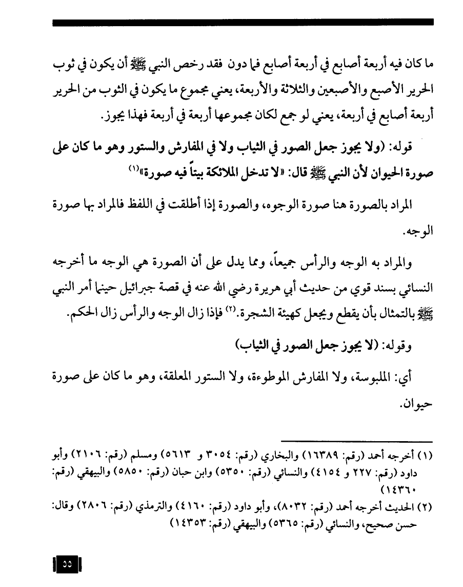 قوله: (ولا يجوز جعل الصور في الثياب ولا في المفارش والستور وهو ما كان على صورة الحيوان لأن النبي - صلى الله عليه وسلم - قال: «لا تدخل الملائكة بيتًا فيه صورة» (¬1).
