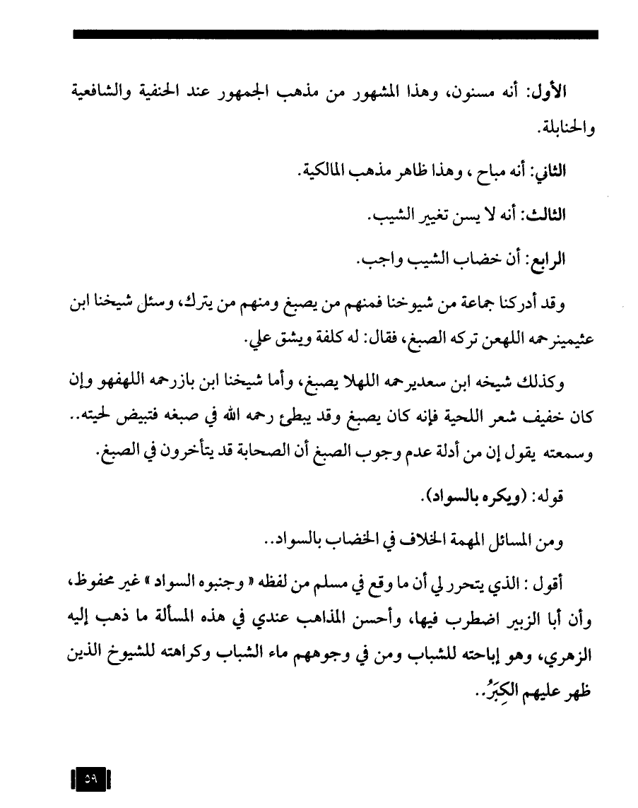 وكذلك شيخه ابن سعدي - رحمه الله - لا يصبغ، وأما شيخنا ابن باز - رحمه الله - فهو وإن كان خفيف شعر اللحية فإنه كان يصبغ وقد يبطئ رحمه الله في صبغه فتبيض لحيته، وسمعته يقول إن من أدلة عدم وجوب الصبغ أن الصحابة قد يتأخرون في الصبغ.