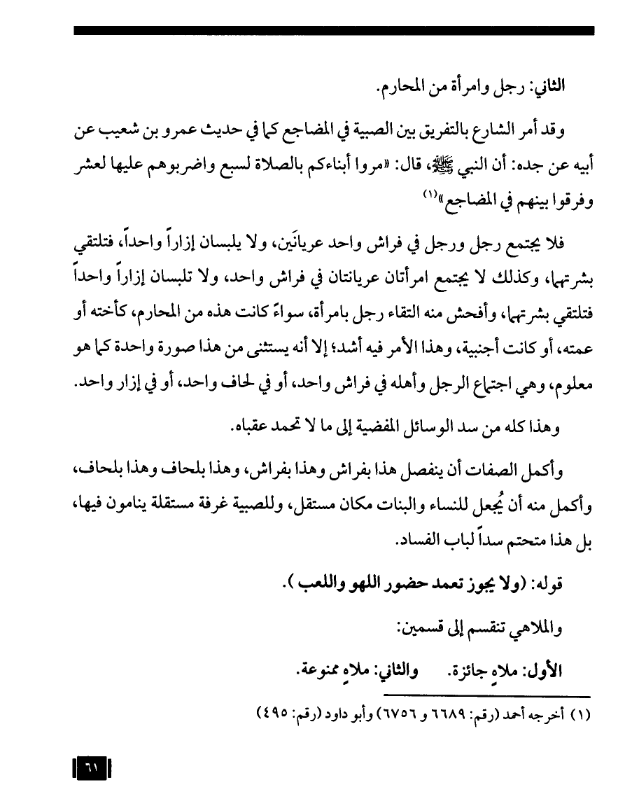 وقد أمر الشارع بالتفريق بين الصبية في المضاجع كما في حديث عمرو بن شعيب عن أبيه عن جده: أن النبي - صلى الله عليه وسلم -، قال: «مروا أبناءكم بالصلاة لسبع واضربوهم عليها لعشر وفرقوا بينهم في المضاجع» (¬1).