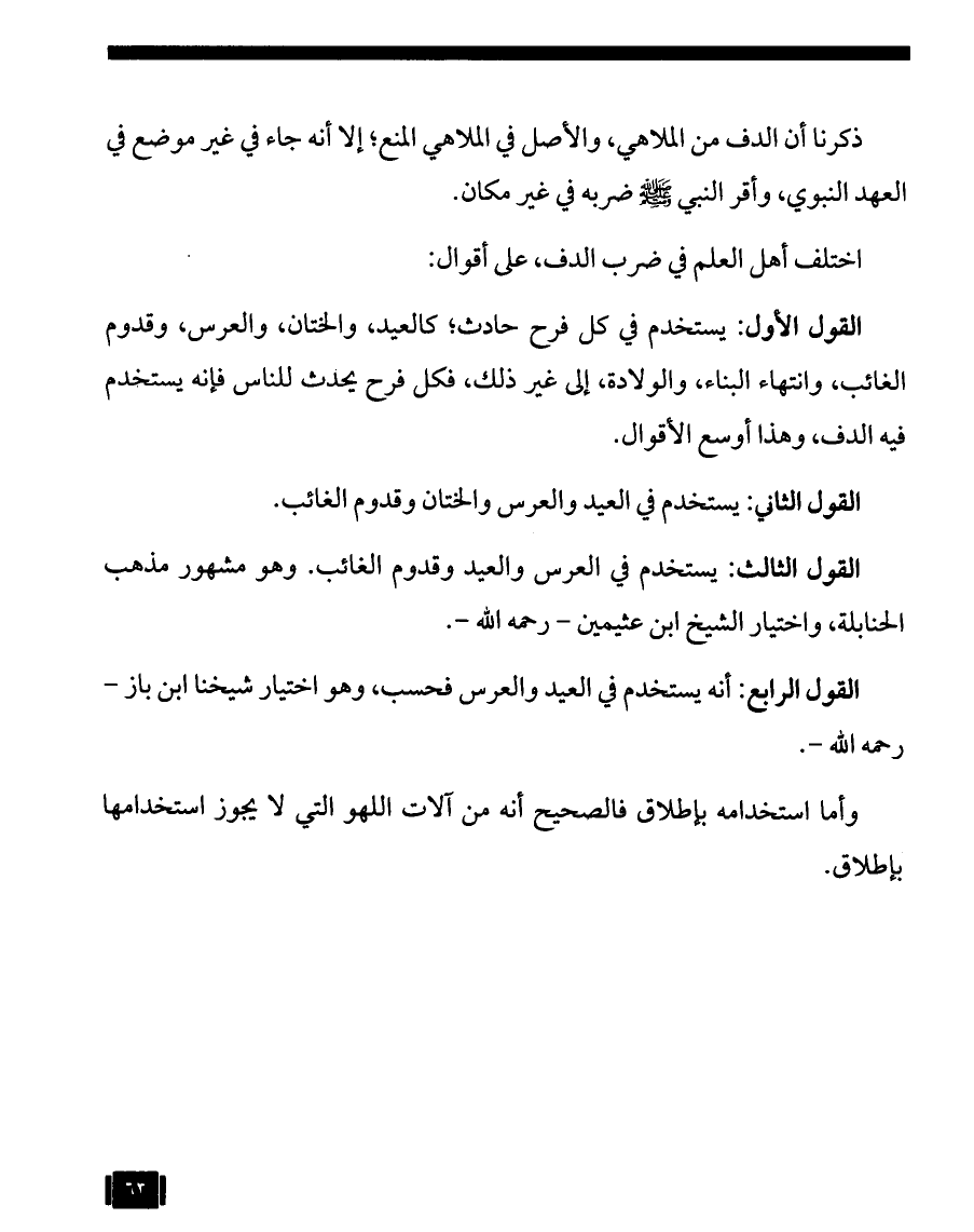 القول الرابع: أنه يستخدم في العيد والعرس فحسب، وهو اختيار شيخنا ابن باز - رحمه الله -.