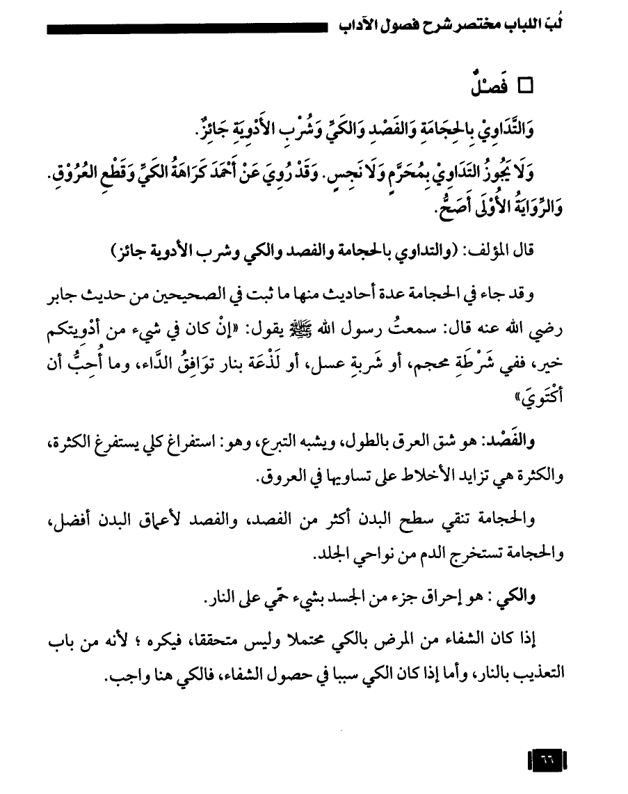 قال المؤلف: (والتداوي بالحجامة والفصد والكي وشرب الأدوية جائز).