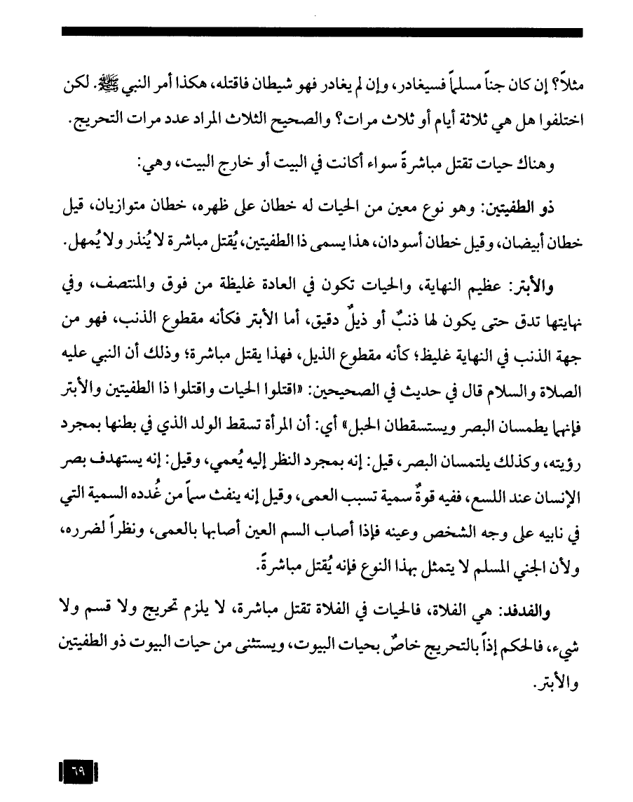 ذو الطفيتين: وهو نوع معين من الحيات له خطان على ظهره، خطان متوازيان، قيل خطان أبيضان، وقيل خطان أسودان، هذا يسمى ذا الطفيتين، يُقتل مباشرة لا يُنذر ولا يُمهل.
