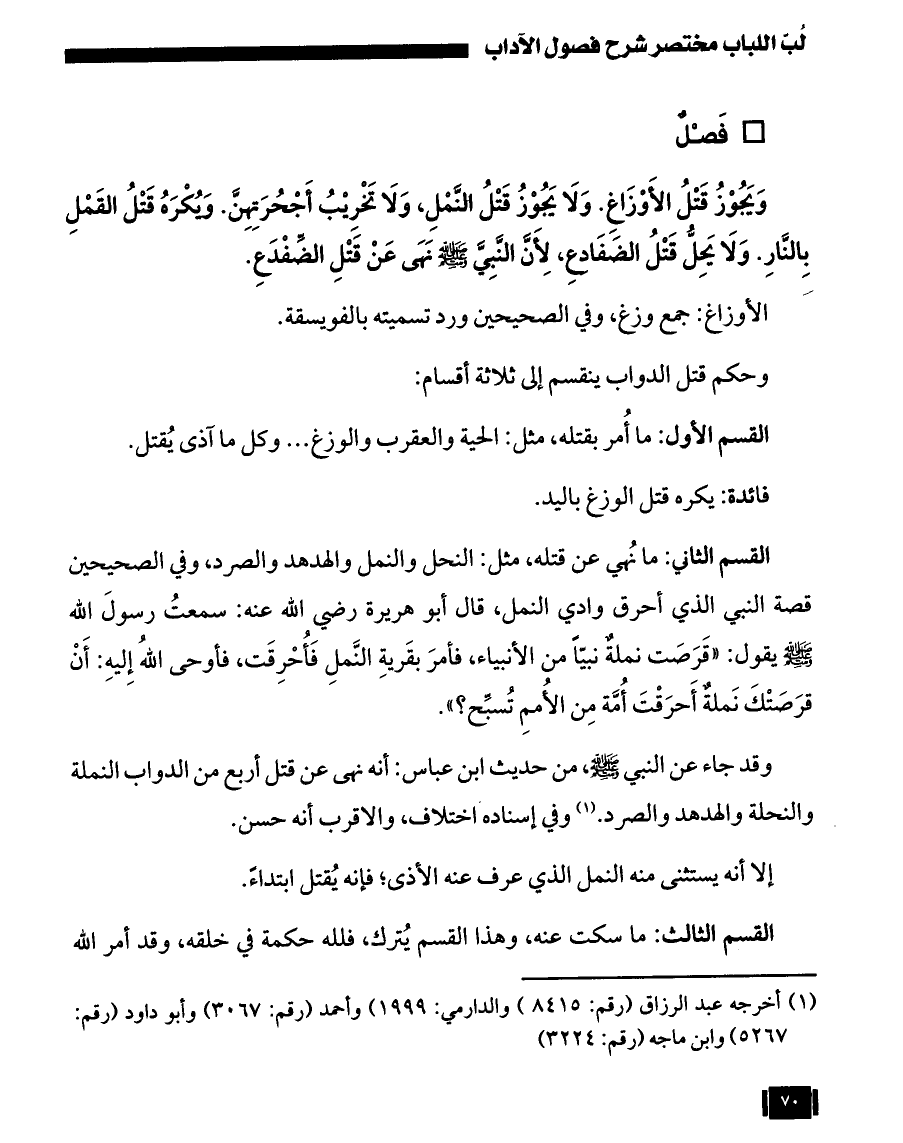وَيَجُوْزُ قَتْلُ الأَوْزَاغِ. وَلَا يَجُوْزُ قَتْلُ النَّمْلِ، وَلَا تَخْرِيْبُ أَجْحُرَتِهِنَّ. وَيُكْرَهُ قَتْلُ القَمْلِ بِالنَّارِ. وَلَا يَحِلُّ قَتْلُ الضَفَادِعِ، لِأَنَّ النَّبِيَّ - صلى الله عليه وسلم - نَهَى عَنْ قَتْلِ الضِّفْدَعِ.