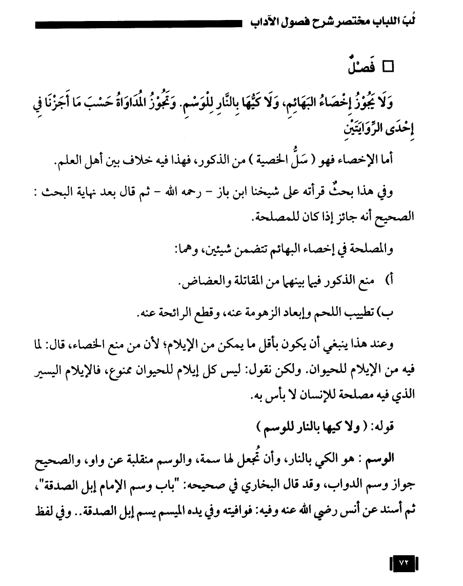 وَلَا يَجُوْزُ إِخْصَاءُ البَهَائِمِ، وَلَا كَيُّهَا بِالنَّارِ لِلْوَسْمِ. وَتَجُوْزُ المُدَاوَاةُ حَسْبَ مَا أَجَزْنَا فِي إِحْدَى الرِّوَايَتَيْنِ