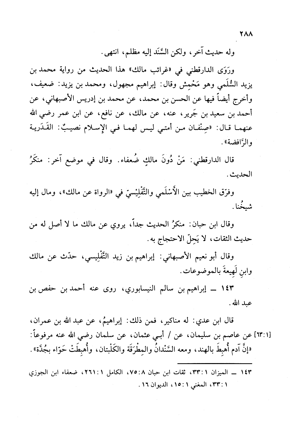 قال ابن عَدِي: له مناكير فمن ذلك: إبراهيم، عَن عَبد الله بن عمران، عن عاصم بن سليمان، عَن أبي عثمان، عن سلمان رضي الله عنه مرفوعا: إن آدم أهبط بالهند ومعه السندان والمطرقة والكلبتان وأهبطت حواء بجدة. -[289]-
