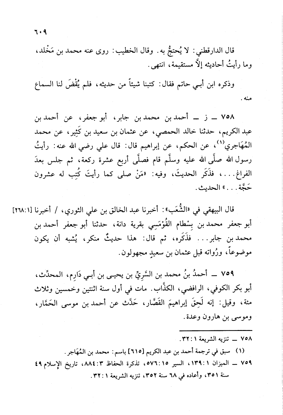 عن أحمد بن عبد الكريم، حَدَّثَنا خالد الحمصي، عن عثمان بن سعيد بن كثير، عَن مُحَمد المهاجري، عن الحكم، عن إبراهيم قال: قال علي رضي الله عنه: رأيت رسول الله صَلَّى الله عَلَيْهِ وَسَلَّمَ قام فصلى أربع عشرة ركعة ثم جلس بعد الفراغ ... فذكر الحديث وفيه: من صلى كما رأيت كتب له عشرون حجة ... الحديث.