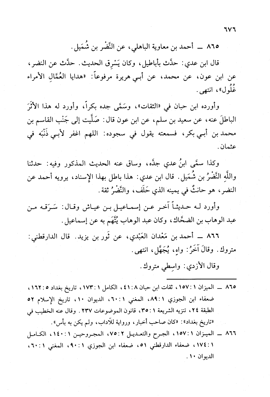 قال ابن عَدِي: هذا باطل بهذا الإسناد يرويه أحمد، عن النضر هو حانث في يمينه الذي حلف والنضر ثقة.