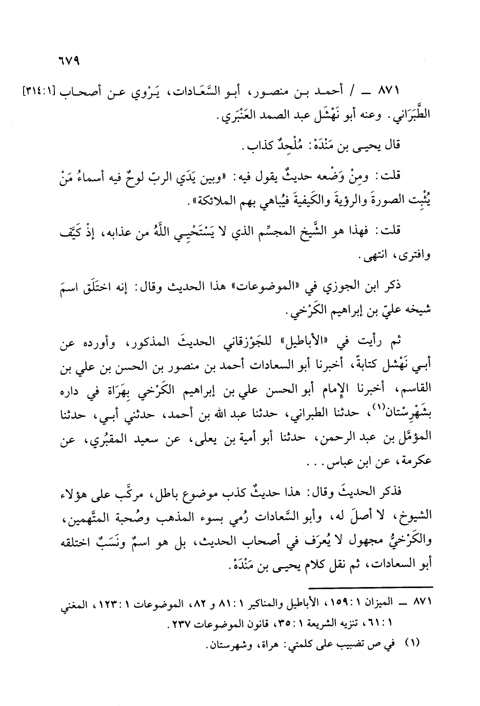 ثم رأيت في "الأباطيل" للجوزقاني الحديث المذكور، وأورده، عَن أبي نهشل كتابة أخبرنا أبو السعادات أحمد بن منصور بن الحسن بن علي بن القاسم أخبرنا الإمام أبو الحسن علي بن إبراهيم الكرخي بهراة في داره بشهرستان، حَدَّثَنا الطبراني، حَدَّثَنا عبد الله بن أحمد، حَدَّثَني أبي، حَدَّثَنا المؤمل بن عبد الرحمن، حَدَّثَنا أبو أمية بن يعلى، عن سعيد المقبري، عن عكرمة، عن ابن عباس ... فذكر الحديث وقال: هذا حديث كذب موضوع باطل مركب على هؤلاء الشيوخ لا أصل له وأبو السعادات رمي بسوء المذهب وصحبة المتهمين والكرخي مجهول لا يعرف في أصحاب الحديث بل هو اسم ونسب اختلقه أبو السعادات ثم نقل كلام يحيى بن منده.