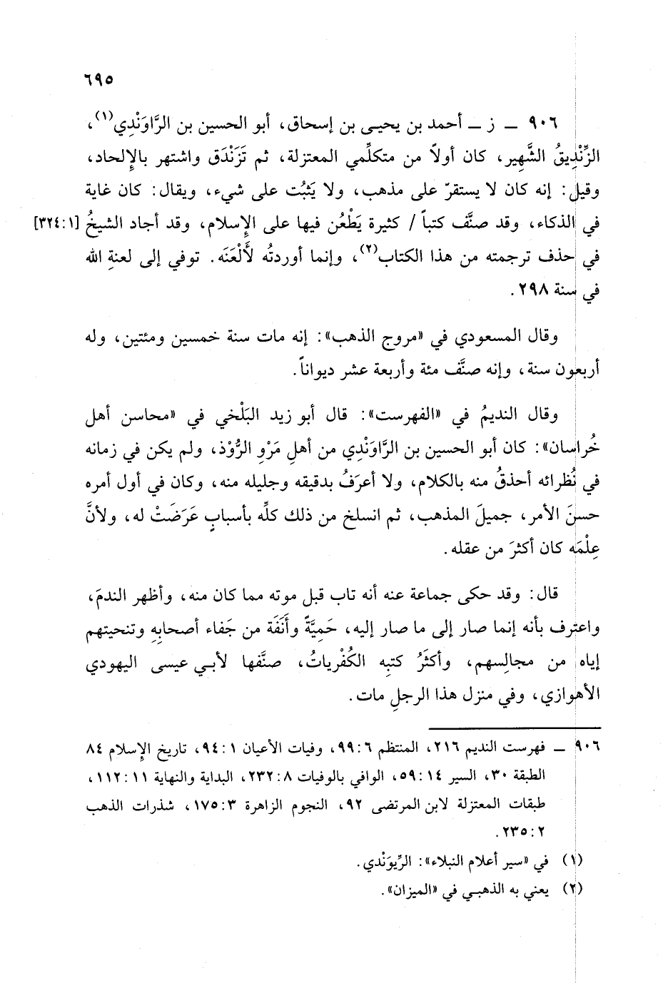 906 - (ز): أحمد بن يحيى بن إسحاق أبو الحسين بن الراوندي الزنديق الشهير.