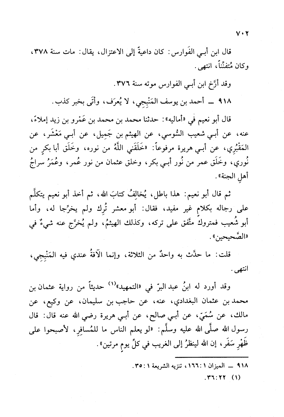 قال أبو نعيم في أماليه: حدثنا محمد بن محمد بن عَمْرو بن زيد إملاء عنه، عَن أبي شعيب السوسي، عن الهيثم بن جميل، عَن أبي معشر، عن المقبري، عَن أبي هريرة مرفوعا: خلقني الله من نوره وخلق أبا بكر من نوري وخلق عمر من نور أبي بكر وخلق عثمان من نور عمر وعمر سراج أهل الجنة.