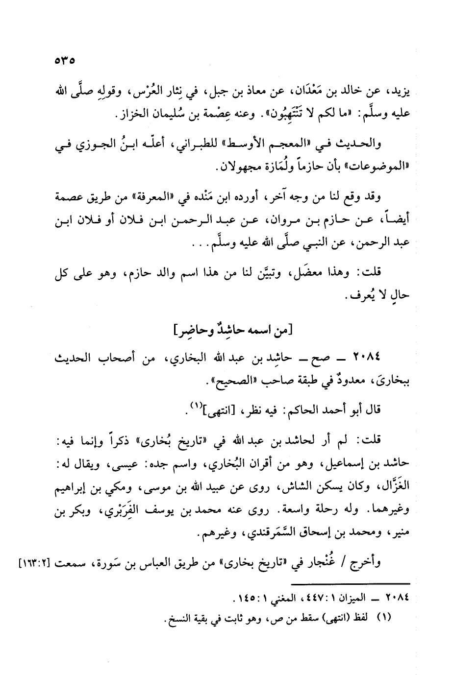 قلت: لم أر لحاشد بن عبد الله في تاريخ بخارى ذكرا وإنما فيه حاشد بن إسماعيل وهو من أقران البخاري واسم جده عيسى ويقال: له الغزال وكان يسكن الشاش روى عن عُبَيد الله بن موسى ومكي بن إبراهيم، وَغيرهما وله رحلة واسعة.