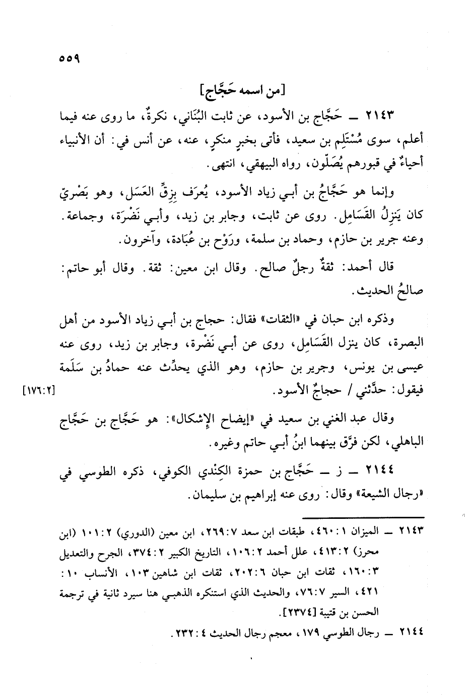 وذَكَره ابن حِبَّان في "الثقات". فقال: حجاج بن أبي زياد الأسود من أهل البصرة كان ينزل القسامل روى، عَن أبي نضرة وجابر بن زيد روى عنه عيسى بن يونس وجرير بن حازم وهو الذي يحدث عنه حماد بن سلمة فيقول، حدثني حجاج بن الأسود.