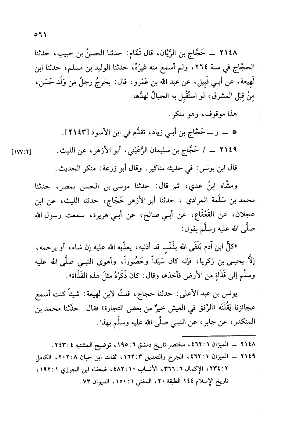 ومشاه ابن عَدِي ثم قال: حَدَّثَنَا موسى بن الحسن بمصر، حَدَّثَنَا محمد بن سلمة المرادي، حَدَّثَنَا أبو الأزهر حجاج، حَدَّثَنَا الليث، عن ابن عجلان، عن القعقاع، عَن أبي صالح، عَن أبي هريرة سمعت رسول الله صَلَّى الله عَلَيْهِ وَسَلَّمَ يقول: كل ابن آدم يلقى الله بذنب قد أذنبه يعذبه الله عليه إن شاء، أو يرحمه إلا يحيى بن زكريا فإنه كان سيدا وحصورا وأهوى النبي صَلَّى الله عَلَيْهِ وَسَلَّمَ إلى قذاة من الأرض فأخذها وقال: كان ذكره مثل هذه القذاة.