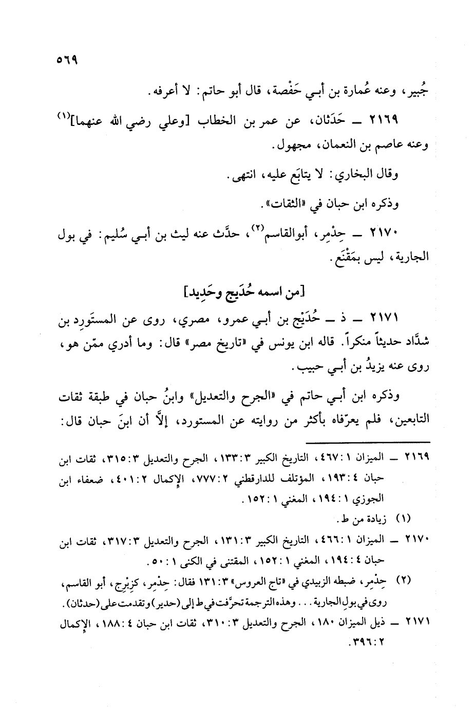وذكره ابن أبي حاتم في "الجرح والتعديل"، وَابن حبان في طبقة ثقات التابعين فلم يعرفاه بأكثر من روايته عن المستورد إلا أن ابن حبان قال: حديج بن عَمْرو وقال: روى عنه الحارث بن يزيد. -[570]-