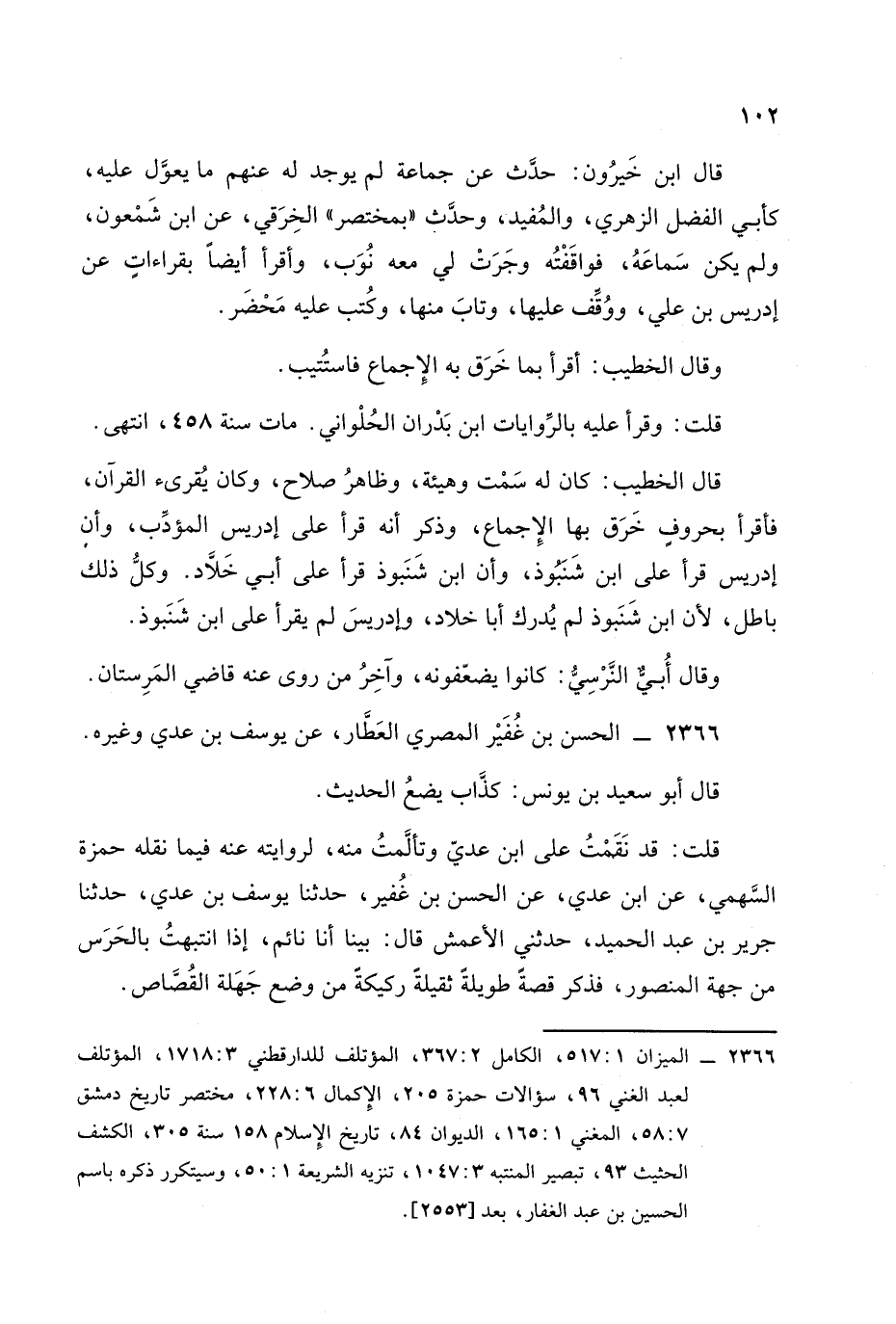 قلت: قد نقمت على ابن عَدِي وتألمت منه لروايته عنه فيما نقله حمزة السهمي، عَنِ ابن عَدِي عن الحسن بن غفير , حَدَّثَنَا يوسف بن عَدِي , حَدَّثَنَا جرير بن عبد الحميد حدثني الأعمش قال بينا أنا نائم إذا انتبهت بالحرس من جهة المنصور فذكر قصة طويلة ثقيلة ركيكة من وضع جهلة القصاص. -[103]-