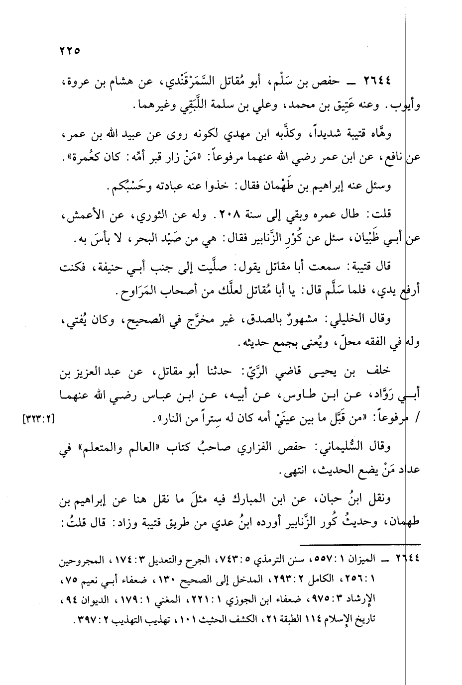 خلف بن يحيى قاضي الري , حَدَّثَنَا أبو مقاتل، عَن عَبد العزيز بن أبي رواد، عَنِ ابن طاوُوس، عَن أبيه، عَنِ ابن عباس رضي الله عنهما مرفوعا: من قبل ما بين عيني أمه كان له سترا من النار.