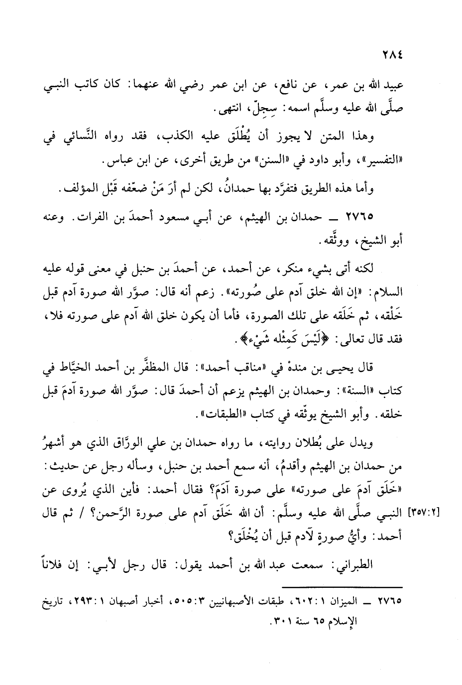 ويدل على بطلان روايته ما رواه حمدان بن علي الوراق الذي هو أشهر من حمدان بن الهيثم وأقدم أنه سمع أحمد بن حنبل وسأله رجل عن حديث "خلق آدم على صورته" على صورة آدم فقال أحمد: فأين الذي يروى عن النبي صَلَّى الله عَلَيْهِ وَسَلَّمَ أن الله خلق آدم على صورة الرحمن ثم قال أحمد: وأي صورة لآدم قبل أن يخلق.