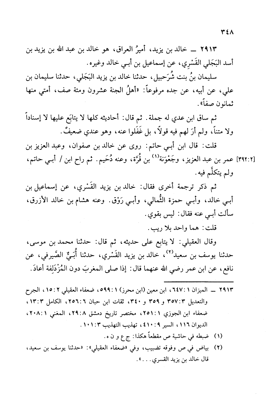 وقال العقيلي: لا يتابع على حديثه ثم قال: حَدَّثَنَا محمد بن موسى , حَدَّثَنَا يوسف بن سعيد , خالد بن يزيد القسري , حَدَّثَنَا أُبي الصيرفي عن نافع، عَنِ ابن عمر رضي الله عنهما قال: إذا صلى المغرب دون المزدلفة أعاد.