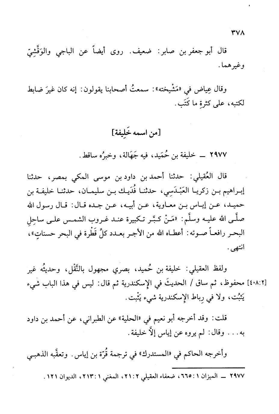 ولفظ العقيلي: خليفة بن حميد بصري مجهول بالنقل وحديثه غير محفوظ ثم ساق الحديث في الإسكندرية ثم قال: ليس في هذا الباب شيء يثبت، وَلا في رباط الإسكندرية شيء يثبت.