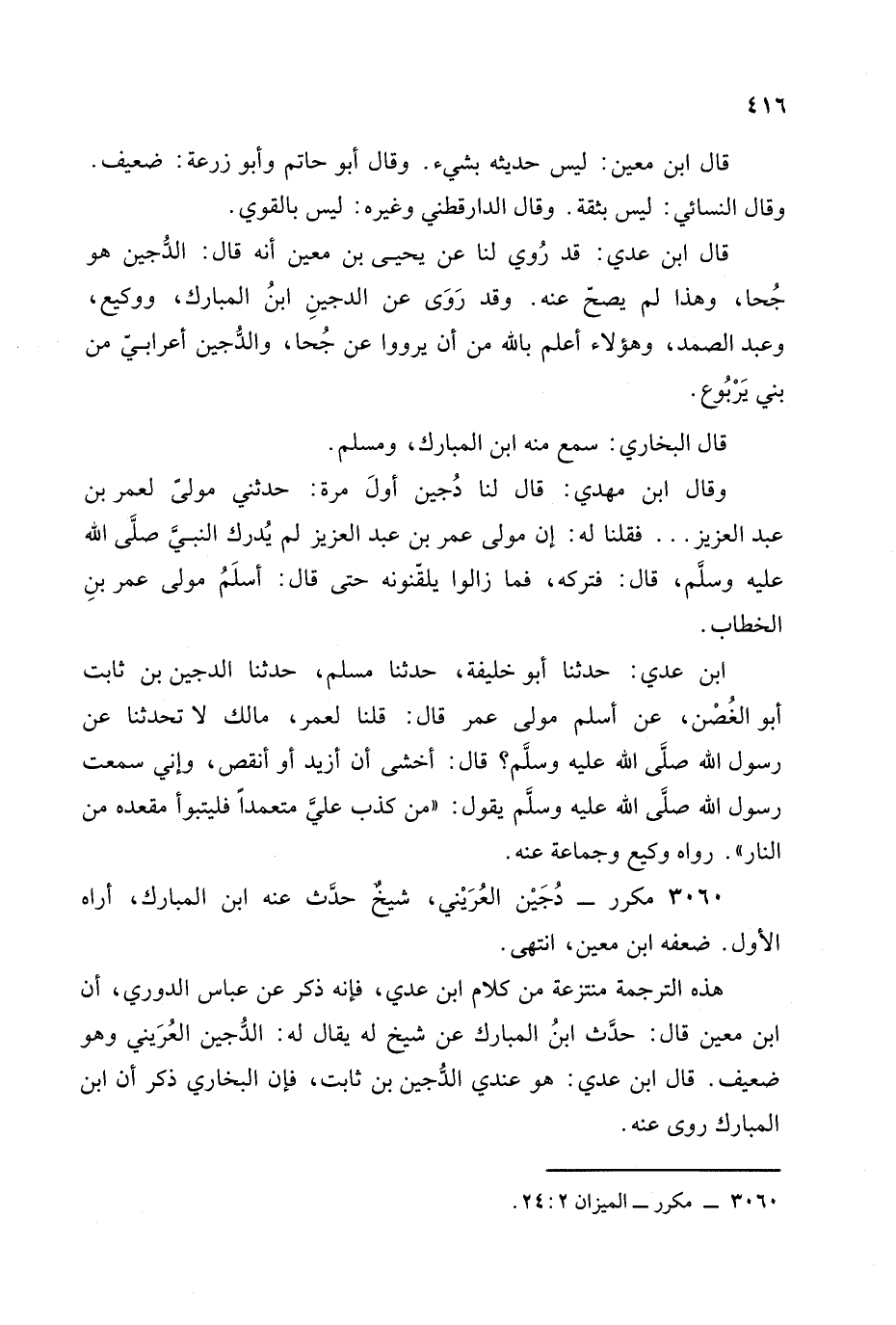 هذه الترجمة منتزعة من كلام ابن عَدِي فإنه ذكر عن عباس الدوري أن ابن مَعِين قال: حدث ابن المبارك عن شيخ له يقال له: الدجين العريني وهو ضعيف.