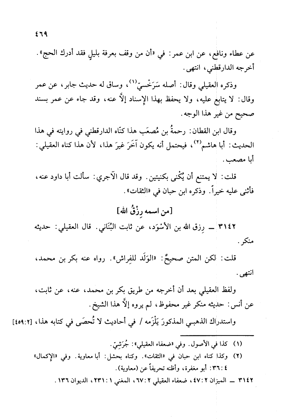 وقد كثر تعجبي من الذهبي في إغفاله في الذي بعده نظير الكلام في هذا وكل منهما ذكره العقيلي بحديث منكر السند محفوظ المتن وسيأتي بيان ذلك في الذي بعده (3144).