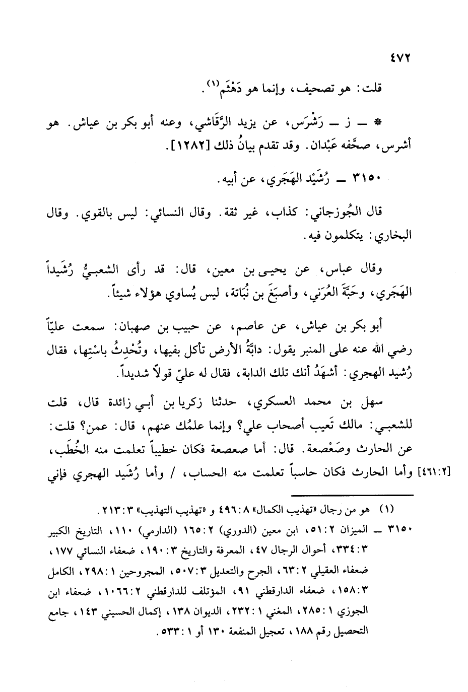 سهل بن محمد العسكري , حَدَّثَنَا زكريا بن أبي زائدة قال: قلت: للشعبي مالك تعيب أصحاب علي وإنما علمك عنهم قال: عمن؟ قلت: عن الحارث وصعصعة قال: أما صعصعة فكان خطيبا تعلمت منه الخطب وأما الحارث فكان حاسبا تعلمت منه الحساب وأما رشيد الهجري فإني أخبركم عنه أني قال لي رجل: اذهب بنا إليه فذهبنا فلما رآني قال للرجل هكذا وعقد ثلاثين يقول كأنه منا. -[473]-