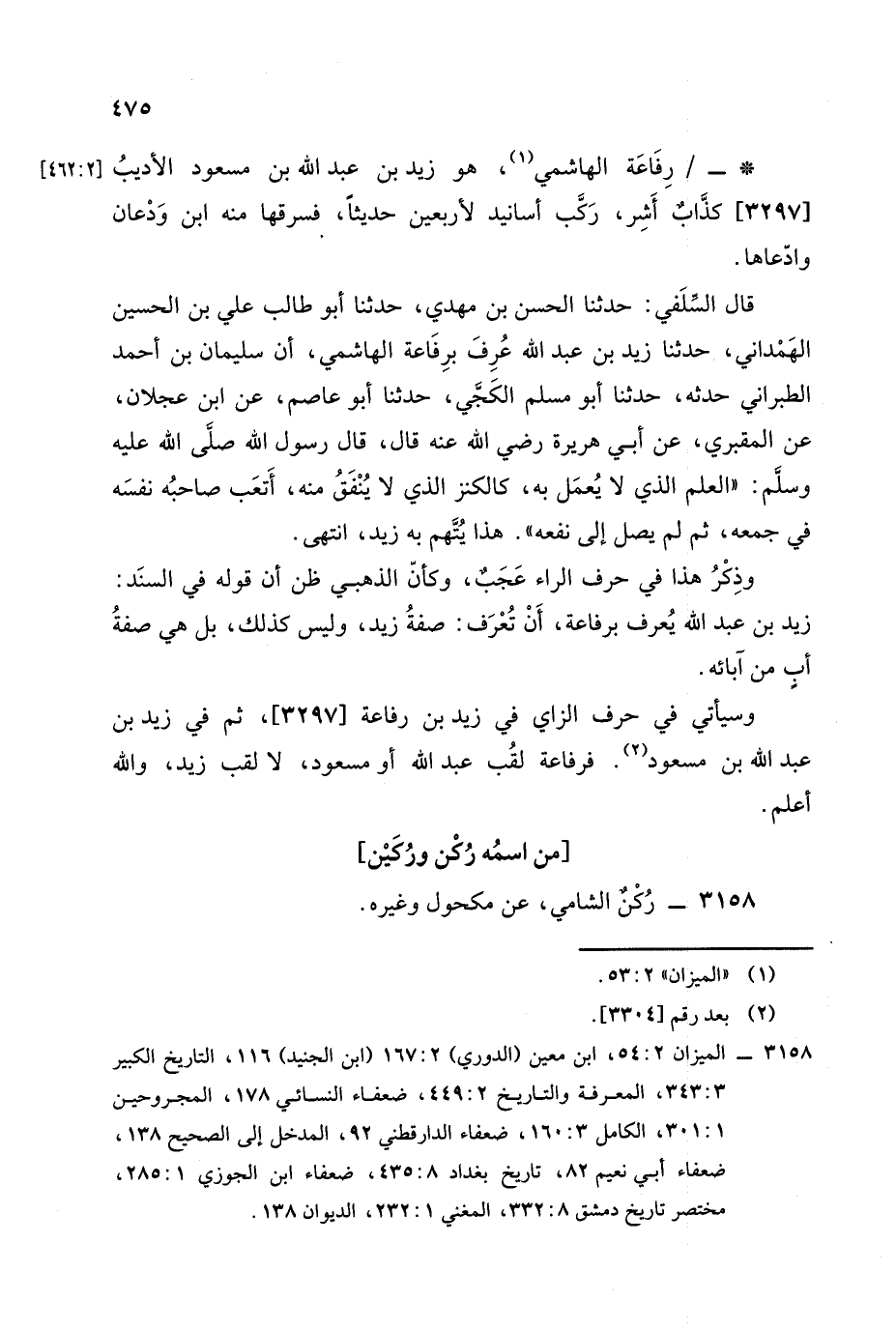 قال السلفي: حَدَّثَنَا الحسن بن مهدي , حَدَّثَنَا أبو طالب علي بن الحسين الهمداني , حَدَّثَنَا زيد بن عبد الله عرف برفاعة الهاشمي أن سليمان بن أحمد الطبراني حدثه , حَدَّثَنَا أبو مسلم الكجي , حَدَّثَنَا أبو عاصم، عَنِ ابن عجلان عن المقبري، عَن أبي هريرة رضي الله عنه قال: قال رسول الله صَلَّى الله عَلَيْهِ وَسَلَّمَ العلم: الذي لا يعمل به كالكنز الذي لا ينفق منه أتعب صاحبه نفسه في جمعه ثم لم يصل إلى نفعه. هذا يتهم به زيد. انتهى.