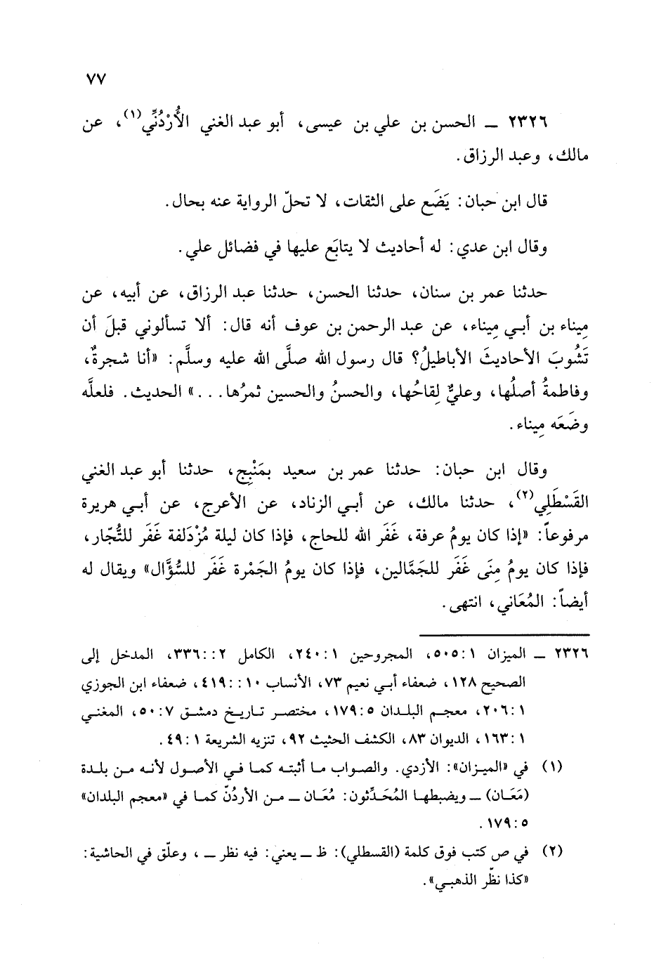 وقال أبو نعيم: والحاكم حدث عن مالك أحاديث موضوعة وتعقب ذلك ابن عساكر بأنه ما أدرك مالكا قلت: والحديث الذي أورده له ابن حبان قد أخرجه الدارقطني في الغرائب من طريقه أخرجه من وجهين عنه لكن زاد بين الحسن ومالك عبد الرزاق وقال باطل وضعه أبو عبد الغني على عبد الرزاق وكذا ساقه ابن عساكر في ترجمته، عَنِ ابن السمرقندي، عَنِ ابن النقور، عَن أبي سعد الإسماعيلي، عَنِ ابن عَدِي عن عمر بن سعيد بن سنان شيخ ابن حبان.
