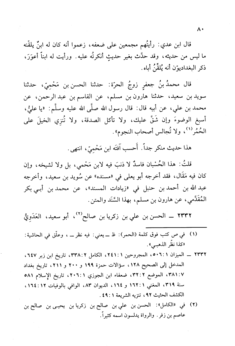 (1) قوله: "الحسن بن علي" سقط من المطبوع، وأثبتناه عن "الكامل" لابن عَدِي 3/ 195.