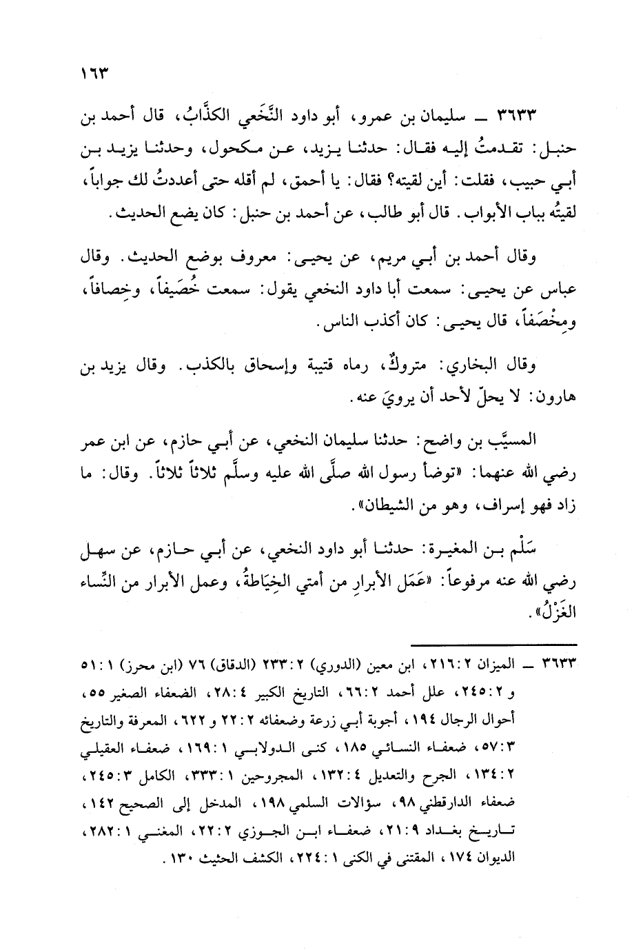 المسيب بن واضح حدثنا سليمان النخعي، عَن أبي حازم، عَنِ ابن عمر رضي الله عنهما: توضأ رسول الله صَلَّى الله عَلَيْهِ وَسَلَّمَ ثلاثا ثلاثا وقال: ما زاد فهو إسراف وهو من الشيطان.