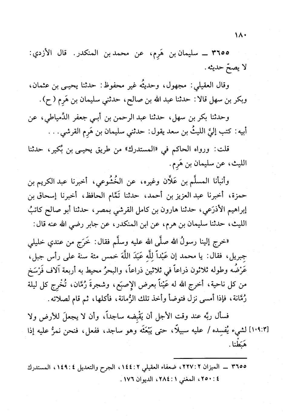 وأنبأنا المسلم بن علان، وَغيره عن الخشوعي أخبرنا عبد الكريم بن حمزة أخبرنا عبد العزيز بن أحمد , حَدَّثَنا تمام الحافظ أخبرنا إسحاق بن إبراهيم الأذرعي , حَدَّثَنا هارون بن كامل القرشي بمصر , حَدَّثَنا أبو صالح كاتب الليث , حَدَّثَنا سليمان بن هرم، عَنِ ابن المنكدر، عَن جَابر رضي الله عنه قال: خرج إلينا رسول الله صَلَّى الله عَلَيْهِ وَسَلَّمَ فقال: خرج من عندي خليلي جبريل فقال: يا محمد , إن عَبْدًا للهِ عَبَدَ اللهَ خمس مِئَة سنة على رأس جبل عرضه وطوله ثلاثون ذراعا في ثلاثين ذراعا والبحر محيط به أربعة آلاف فرسخ من كل ناحية أخرج الله له عينا بعرض الإصبع وشبحرة رمان تخرج كل ليلة رمانة فإذا أمسى نزل فتوضأ وأخذ تلك الرمانة فأكلها ثم قام لصلاته.