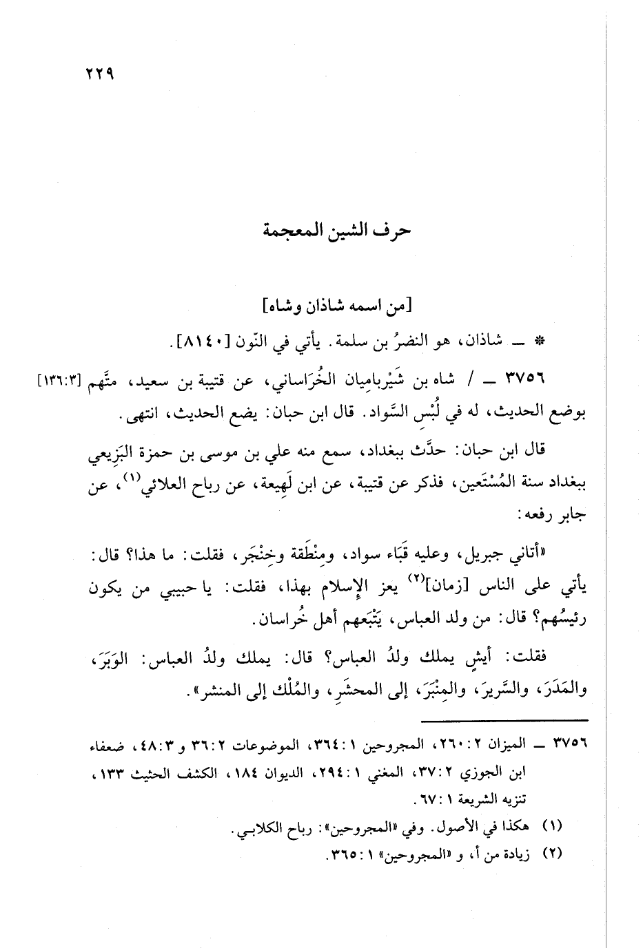 قال ابن حبان: حدث ببغداد سمع منه علي بن موسى بن حمزة البزيعي ببغداد سنة المستعين فذكر عن قتيبة، عَنِ ابن لَهِيعَة عن رباح العلائي، عَن جَابر رفعه: أتاني جبريل وعليه قباء سواد ومنطقة وخنجر فقلت: ما هذا؟ قال: يأتي على الناس زمان يعز الإسلام بهذا فقلت: يا حبيبي من يكون رئيسهم؟ قال: من ولد العباس يتبعهم أهل خراسان.