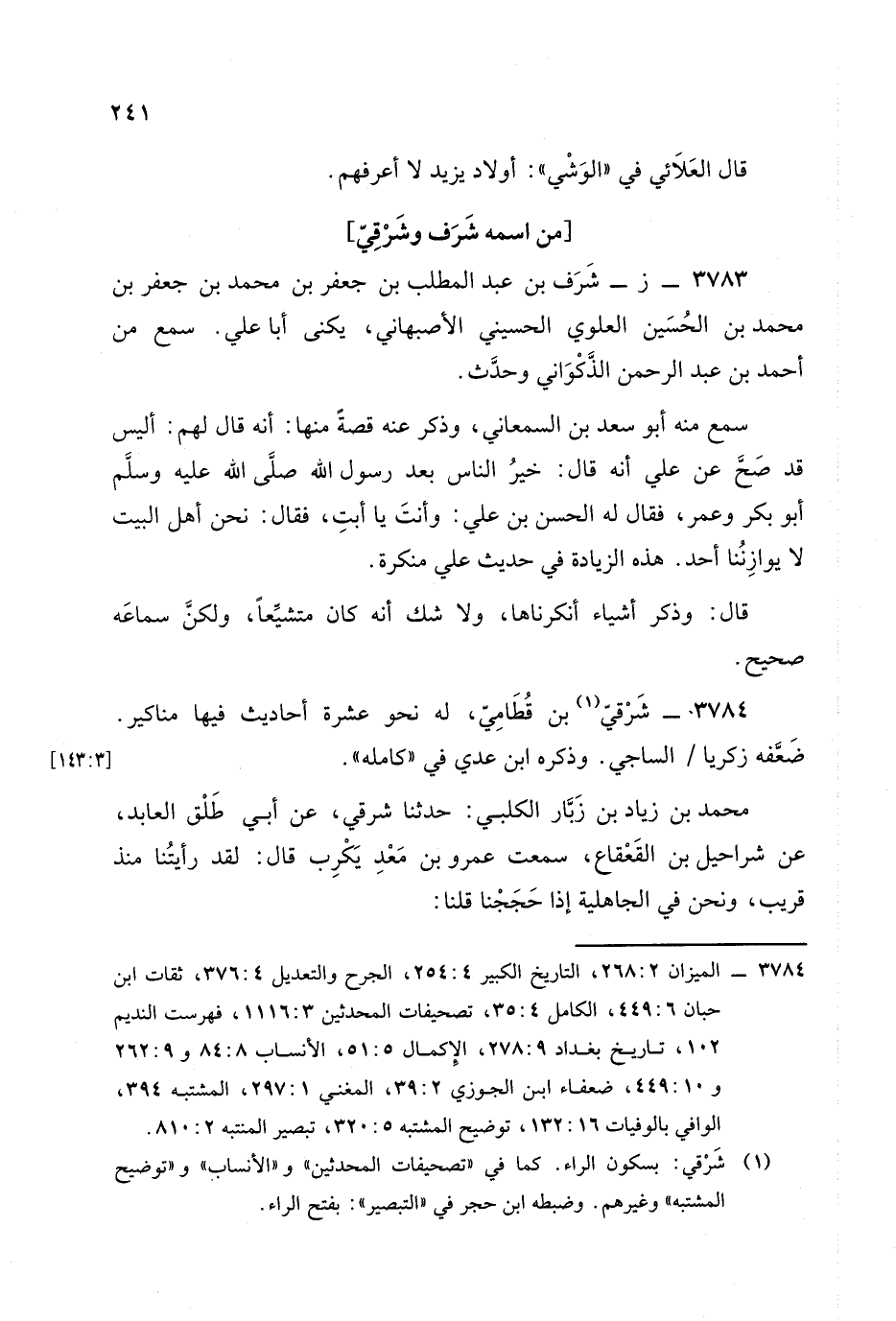 3783 - (ز): شرف بن عبد المطلب بن جعفر بن محمد بن جعفر بن محمد بن الحسين العلوي الحسيني الأصبهاني، يكنى أبا علي.